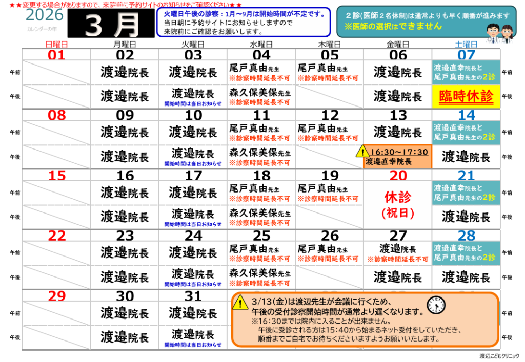 令和7年7月より、毎月第3金曜日の午後は渡辺先生が昼に会議に行くため、診察・受付開始時間が遅くなる場合があります。