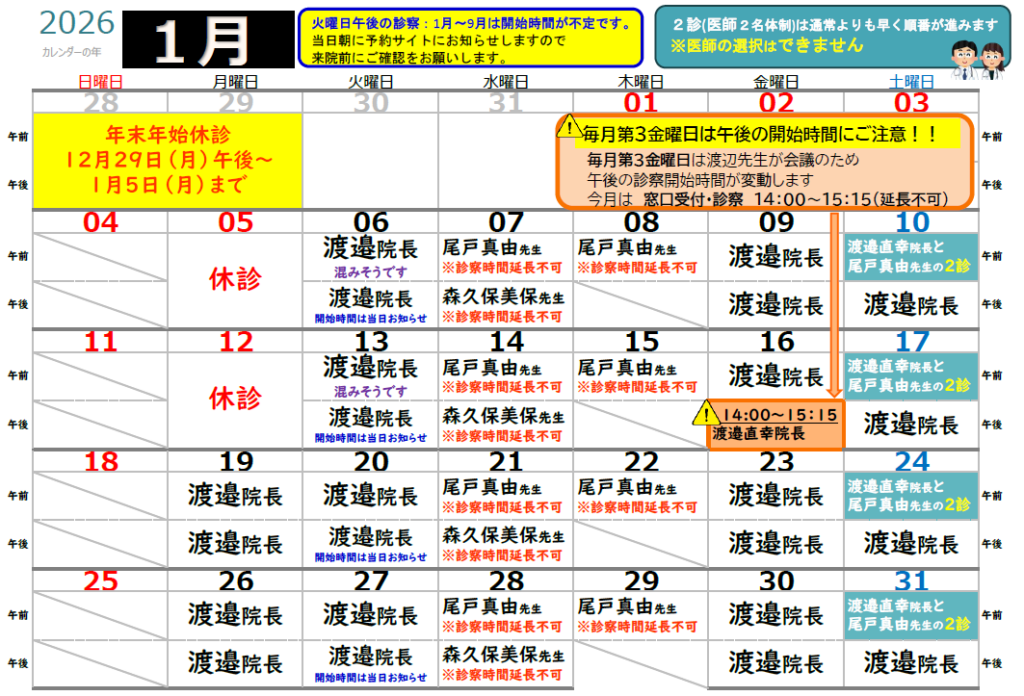 急遽診療時間短縮や臨時休診させていただく場合がございますので、ご来院前に予約サイトのお知らせ欄もご確認くださいますようお願いいたします。